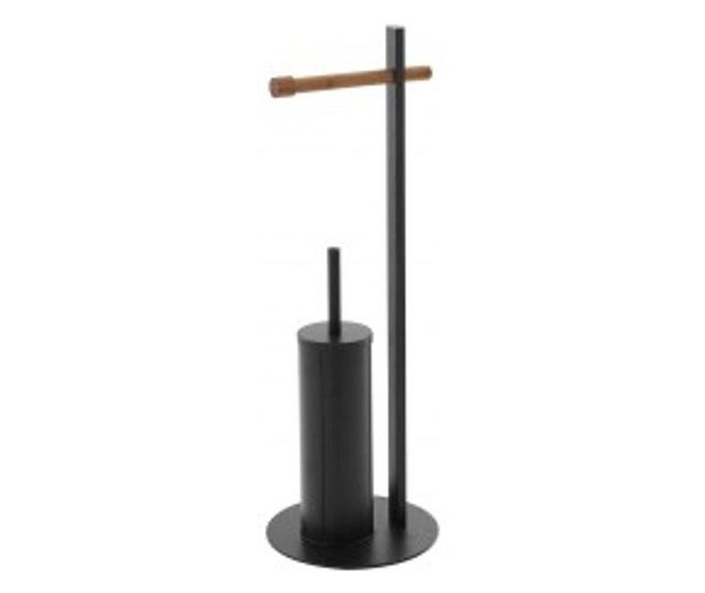 Függőleges tartó WC-papírhoz és ecsetekhez, fekete, krómozott acél, bambusz, magasság 67cm