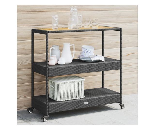 3 szintes fekete polyrattan és tömör akácfa zsúrkocsi