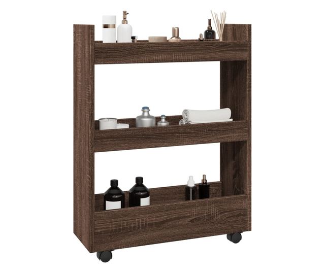 3 szintes barna tölgy színű szerelt fa keskeny tárolókocsi