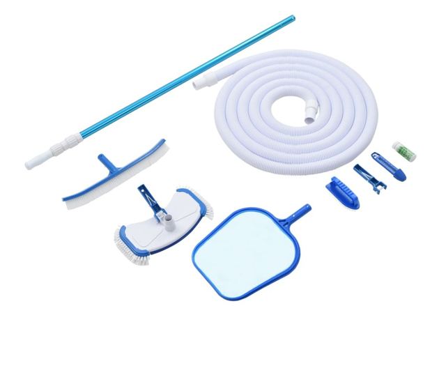A szállítmány 1 vákuumszivattyút, 1 medencetisztító hálót, 1 fal tisztító kefét, 1 súrolókefét, 1 alumínium rudat, 1 polimer cserefogantyút, 1 hőmérőt, 1 tesztcsíkot és 1 fehér tömlőt tartalmaz.