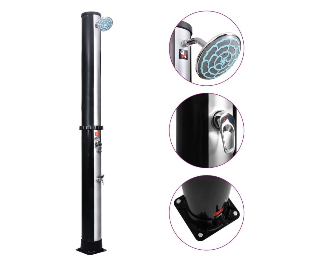 Szolárzuhanyunkkal frissítő zuhanyzásban lehet része a kertben vagy a medence mellett úszás előtt vagy után. A zuhany könnyen a kerti tömlőhöz csatlakoztatható, ahonnan a hideg vizet kapja. Az összegyűjtött napenergia felmelegíti a vizet a tartályban, és tökéletes zuhanyt kínál Önnek! A víz 60°C-ig melegíthető. 40 l-es tartállyal lett felszerelve.