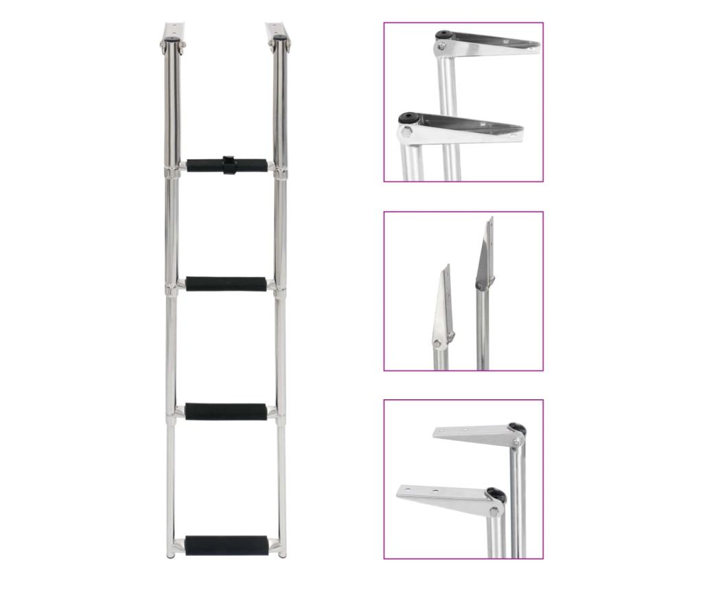 A különleges teleszkópos kialakításnak köszönhetően a létrát gyorsan és könnyen lehet kinyitni, megkönnyítve a biztonságos beszállást. Minden lépcsőfok csúszásgátló felületű, ami maximális mértékben garantálja a biztonságot. A nagy szilárdságú rozsdamentes acélból készült hajólépcső maximálisan tartós, és nagy, 250 kg-os súlyt képes megtartani. Használaton kívül pánttal rögzítheti a lépcsőket. A szerelési kiegészítők alaptartozékok.