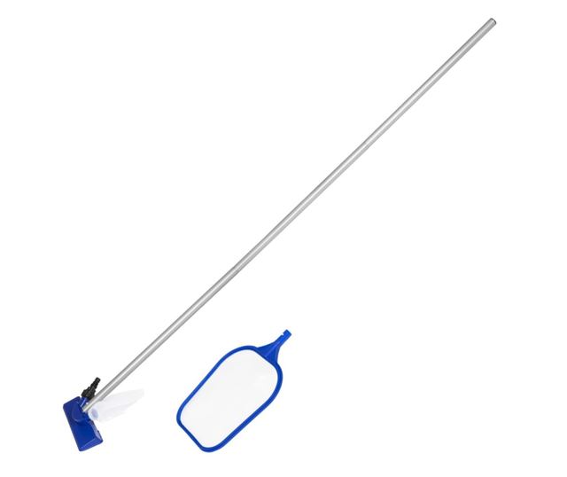 A szett 4 elemes rudat, cserélhető medenceporszívófejet és szűrőfejet tartalmaz. A levélszűrő hatékonyan képes bármilyen típusú törmelék, levél, szennyeződés, valamint egyéb, a medencében úszó tárgy megfogására, míg a porszívófej bármilyen szokásos kerti tömlőhöz csatlakoztatható, hogy a törmeléket a medence alatti zsákba gyűjtse.