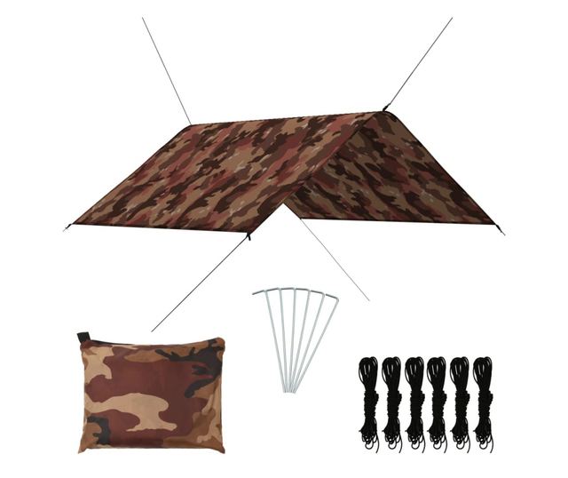 A kempingsátor 180 T poliészter szövet PA bevonatból készült, amely védi Önt és holmiját esős időben és blokkolja a legkárosabb sugarakat. A tisztán látható varrás lehetővé teszi, hogy közvetlenül kinyissa, majd a cövekek és kötelek segítségével kikösse. Könnyű, és tárolótáskával is rendelkezik, így kényelmesen elvihető kirándulásokra, és könnyen tárolható, ha nincs használva. 6 cöveket és 6 kötelet tartalmaz a csomag a gyors és egyszerű rögzítéshez.