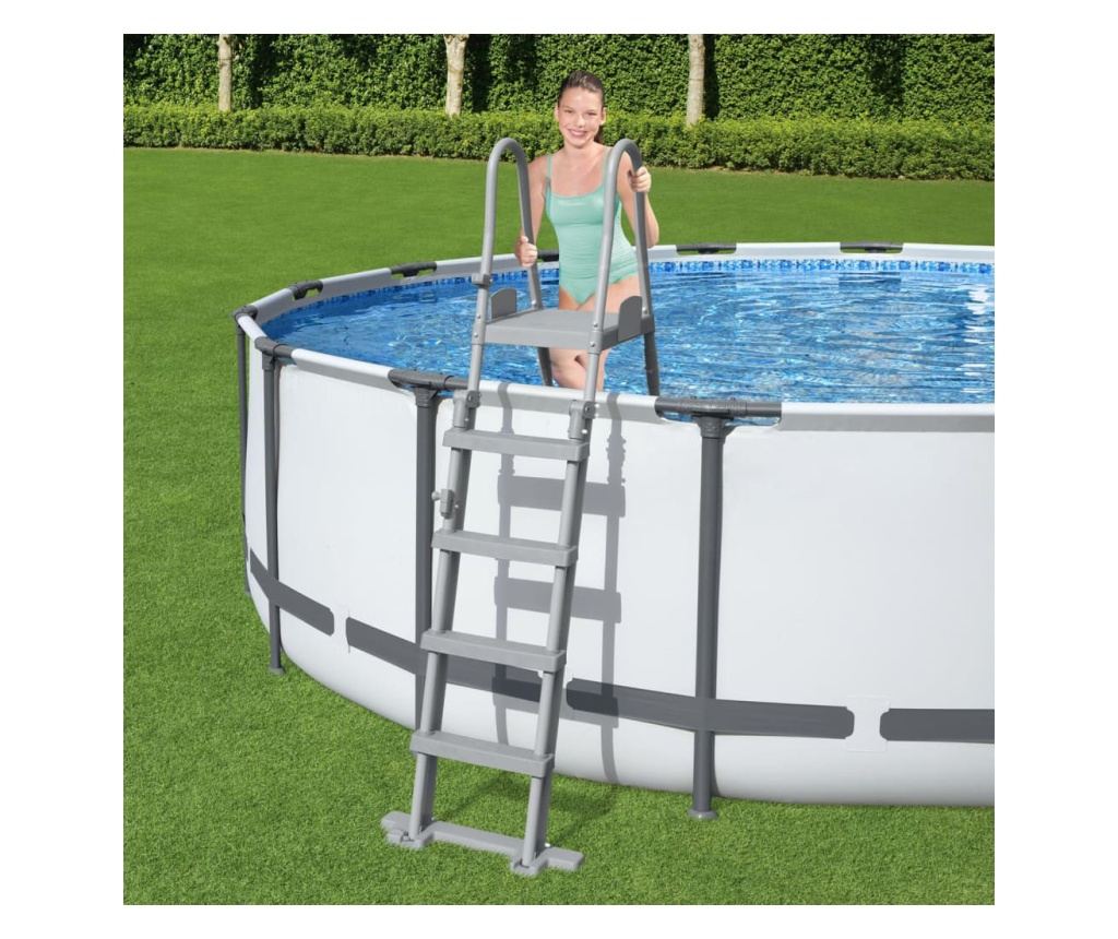 Ennek a talajszint feletti úszómedencékhez használható Bestway Flowclear négyfokos biztonsági medencelétrának a segítségével az úszók kényelmesen és biztonságosan szállhatnak be és ki a medencéből.