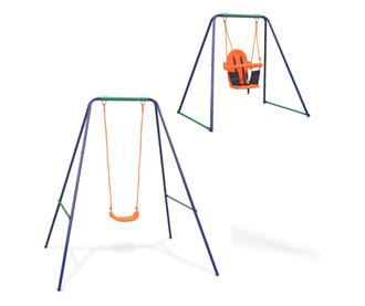 Az egyszemélyes hinta kampókkal, csavarokkal és kötelekkel lett biztosan rögzítve az A-alakú keresztrúdra. A totyogó hinta kényelmes, ergonómiailag kialakított ülésekkel és magas háttámlával rendelkezik. Az elöl lévő biztonsági övnek köszönhetően az ülés rendkívül stabil és biztonságos. Az acél váz és az erős műanyag ülés nagyon időtálló és időjárásálló.