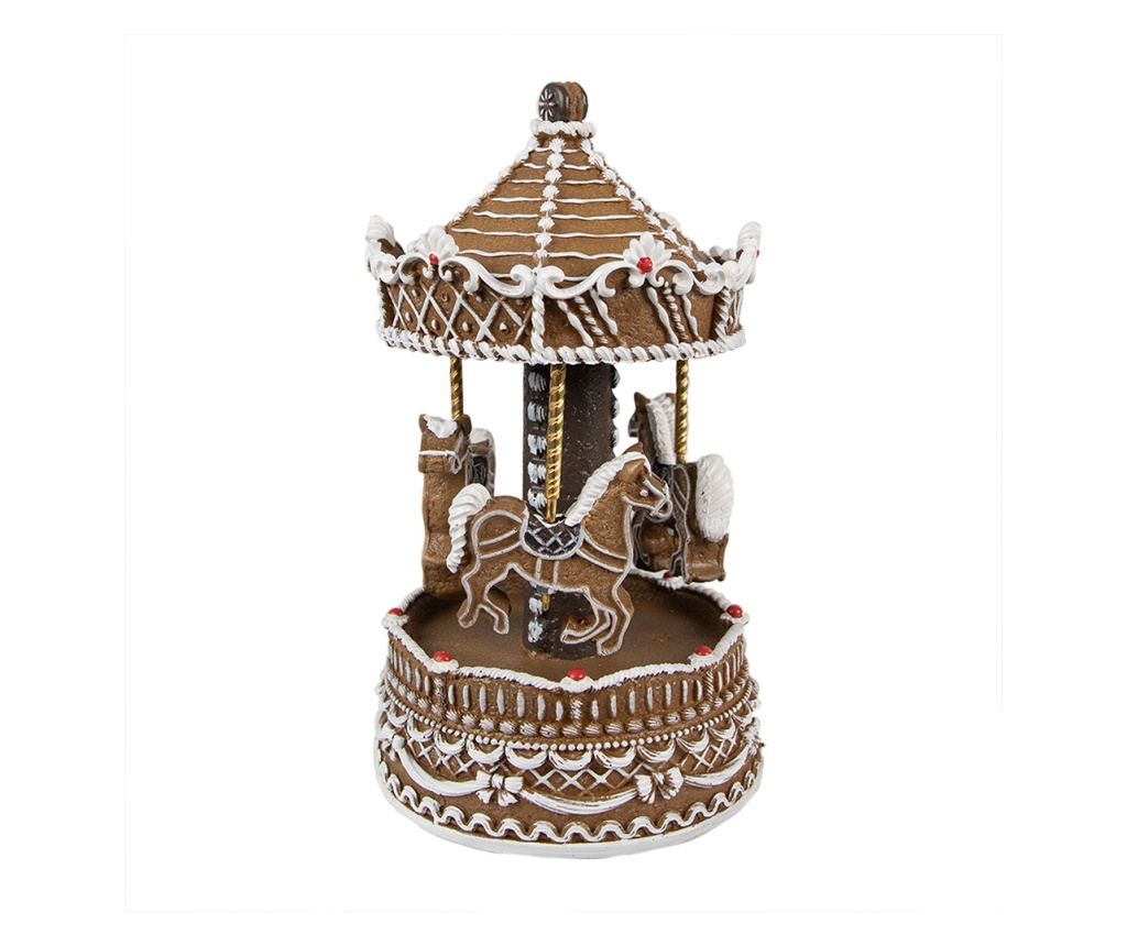 Ez az ünnepi körhinta polirezinből készült, és a "Jingle Bells" karácsonyi dalt játssza. Átmérője 12 cm, magassága 22 cm, barna és fehér színösszeállításban.