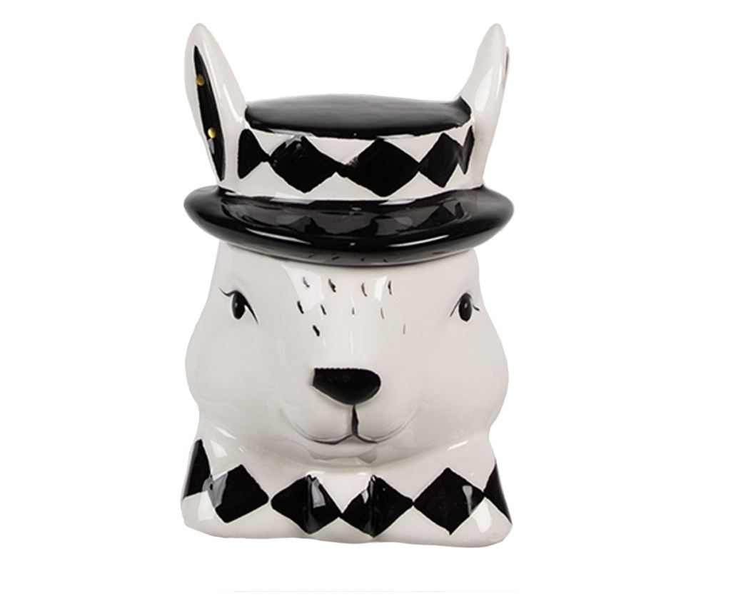 Ez a kerámia nyuszi tároló fedővel rendelkezik. Méretek: 9 cm (hosszúság) x 8 cm (szélesség) x 11 cm (magasság). Szín: Fehér és fekete. Stílus: Modern. A Húsvéti Kollekció része.