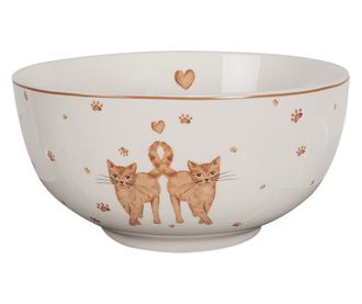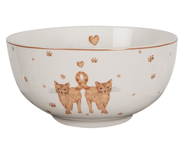 2 darabos, fehér és barna porcelán tál macska mintával, 14x7 cm, 500 ml