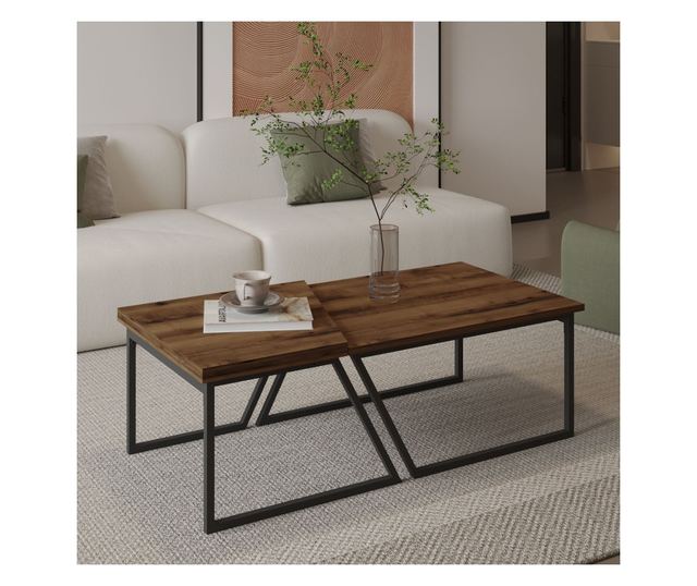 Adjon egy csipetnyi kifinomultságot otthonához ezzel a lenyűgöző dohányzóasztal szettel. A letisztult dizájn és a fekete fém lábak modern megjelenést kölcsönöznek neki, míg a rusztikus dió szín egy csipetnyi bájt ad hozzá. Akár egy csésze kávét fogyaszt, akár egy összejövetelt rendez, ez a szett tökéletes kiegészítője nappalijának.