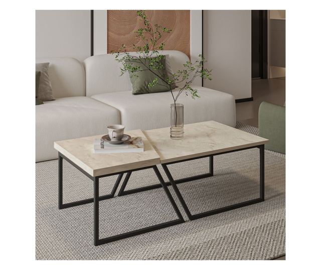 Ennek a dohányzóasztal szettnek a letisztult dizájnja azonnal feldobja bármelyik szoba megjelenését. A travertin szín luxust kölcsönöz, míg a fekete fém lábak modern és elegáns esztétikát biztosítanak.