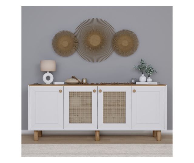 Ez a konzol nemcsak funkcionális, hanem sokoldalú is. A nagyobb stabilitás és a modern megjelenés érdekében a falhoz rögzíthető. A 180 cm szélesség, 75 cm magasság és 40 cm mélység bőséges tárolóhelyet biztosít anélkül, hogy túl sok helyet foglalna, így tökéletes bármilyen méretű nappaliba.