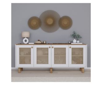 Ez a konzol nem csak funkcionális, hanem sokoldalú is. A nagyobb stabilitás és a modern megjelenés érdekében a falhoz rögzíthető. A 180 cm szélesség, 75 cm magasság és 40 cm mélység bőséges tárolóhelyet biztosít anélkül, hogy túl sok helyet foglalna el, így tökéletes bármilyen méretű nappaliba.