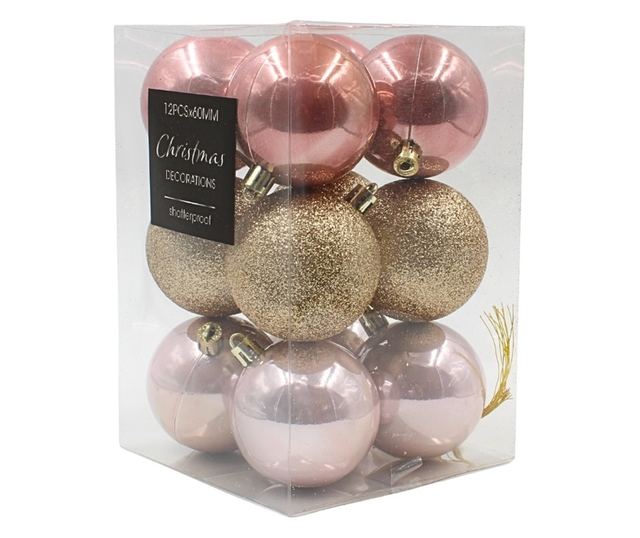 12 darabos karácsonyi gömbdísz készlet, rózsaszín és arany, 6 cm, Karácsonyi varázslat