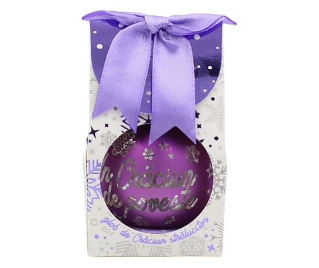 Karácsonyi gömb LED-del, lila, "Tündérmese karácsony" felirattal