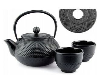 Teáskanna és 2 csésze szett, fekete öntöttvas, 0,8 L