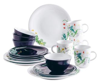A 4 személyes készlet tartalma: bögrék (0,35 liter), tálak (0,50 l), közepes tányérok (Ø21,5 cm), vacsoratányérok (Ø26,5 cm).