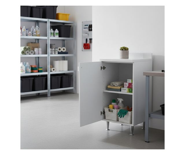 Kívül kompakt, belül tágas: ez az 1 ajtós, matt fehér színű alsószekrény 45×85×38 cm (szé×ma×mé) méretű, és rendet teremt, ahol csak szükséges. A fürdőszobában vagy a mosókonyhában tárolhatunk benne mosószereket, törlőkendőket és papírtekercseket; az előszobában cipők és mindennapi holmik tárolására alkalmas; a dolgozószobában papírkötegeket, mappákat és anyagokat tarthatunk benne; a gyerekszobákban rendben tartja a játékokat és könyveket; az erkélyeken/teraszokon pedig cserepes növényeket és kerti kiegészítőket tárolhatunk. Belül 1 állítható polcot, fém zsanérokat és egy mély, a teljes szélességben használható rekeszt tartalmaz. Melamin bevonatú forgácslapból készült, sima élekkel és ABS lábakkal/csúszkákkal, amelyek védik a padlót. A felső felület használható töltőállomásként, rendszerezőként vagy tálcákként. Teljesen összeszerelve szállítjuk: csak helyezze el és használja azonnal.