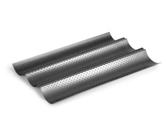 Ez a sokoldalú, bagettekhez és tányérokhoz való forma 18/8 rozsdamentes acélból készült, amely ideális acél a sütési feladatokhoz, mivel 230 °C feletti hőmérsékletnek is ellenáll, deformáció nélkül. Ebben a formában akár négy bagett sütésére is van hely, 33 x 38 cm-es méretek megtartásával. Ennek a formának a kialakítása lehetővé teszi, hogy bárki tökéletes bagettet süthessen, köszönhetően a vályúknak, amelyek lehetővé teszik a tészta alakjának megőrzését a sütés során.