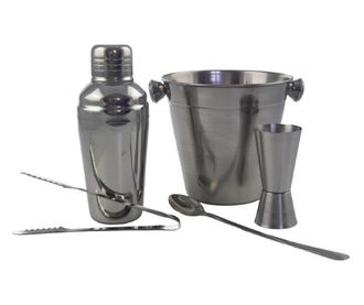 5 darabos minibár kellékkészlet: jégvödör, koktélshaker, csipesz, fogó, hosszú nyelű bárkanál
