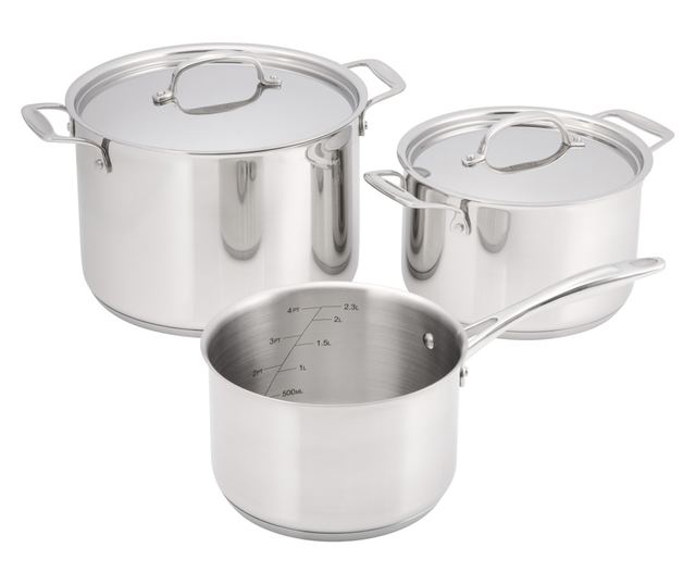 - A készlet 2 fedeles edényt (20 cm és 24 cm átmérőjű) és 1 fedél nélküli lábast (18 cm átmérőjű) tartalmaz.