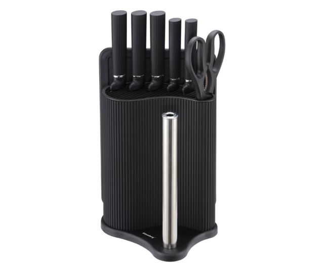 A KLAUSBERG KB-7977 késkészlet öt acélkést, konyhai ollót, vágódeszkát és egy papírtörlő-tartóval ellátott állványt tartalmaz. A matt fekete kialakítás és a kompakt alak rendet tart a munkafelületen, míg a bordázott, csúszásmentes fogantyúk stabil fogást biztosítanak munka közben. A kések gyárilag élezettek és használatra készek, az állvány pedig egy helyen gyűjti össze az összes szerszámot.