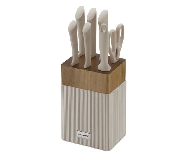Klausberg KB 7984 késkészlet, 8 darabos, rozsdamentes acél, hegyező, akácfa állvány, bézs/fa