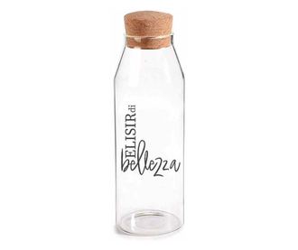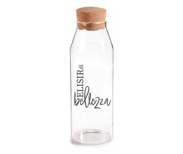 Üvegből készült, parafa tetővel. Élelmiszerrel való közvetlen érintkezésre alkalmas. Méretek: 8,5 cm átmérő x 27,5 cm magasság. Űrtartalom: 1200 ml.