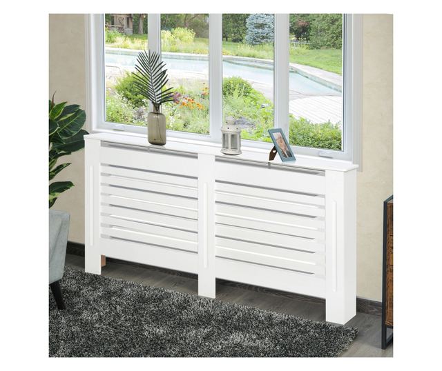A modern HOMCOM szekrény elrejti az öreg vagy csúnya radiátorokat, védi a kezeket a forró felületektől, és polcokat kínál dekorációknak. Rácsos kialakításával és megfelelő szellőzésével az optimális hőáramlás érdekében megakadályozza, hogy gyermekek és háziállatok érintkezésbe kerüljenek a radiátorral. Tartós MDF-ből készült és fehérre festett, stílusos és hasznos kiegészítő otthonába vagy irodájába.