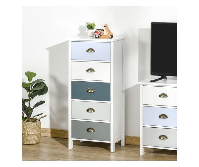 Alakítson át bármilyen teret a stílusos, helytakarékos HOMCOM komóddal. Öt fiókjával ez a komód megkönnyíti a ruhák, könyvek és kiegészítők rendszerezését. A neutrális tónusú, többszínű fiókok zökkenőmentesen illeszkednek más szobai színekhez. Az MDF fa szerkezet biztosítja a tartósságot, a vékony kialakítás pedig ideális kis helyekre. A fém fogantyúk teszik teljessé a megjelenést, megkönnyítve a fiókok nyitását.
