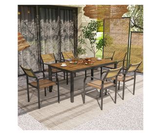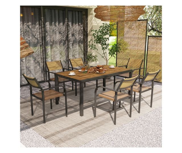 Alakítsa át kerti összejöveteleit az Outsunny kerti étkezőgarnitúrával. Ez a sokoldalú, 7 részes szett egy kihúzható asztalt tartalmaz, amely 160-ról 240 cm-re állítható, hogy bármilyen térhez illeszkedjen, valamint egymásra rakható székeket a rendezett tárolás érdekében. Élvezze az alacsony karbantartási igényű tartósságot a DPC asztallappal, és maradjon hűvös a meleg napokon a légáteresztő textilene ülőfelületeknek és az elegáns kompozit fa háttámláknak köszönhetően.
