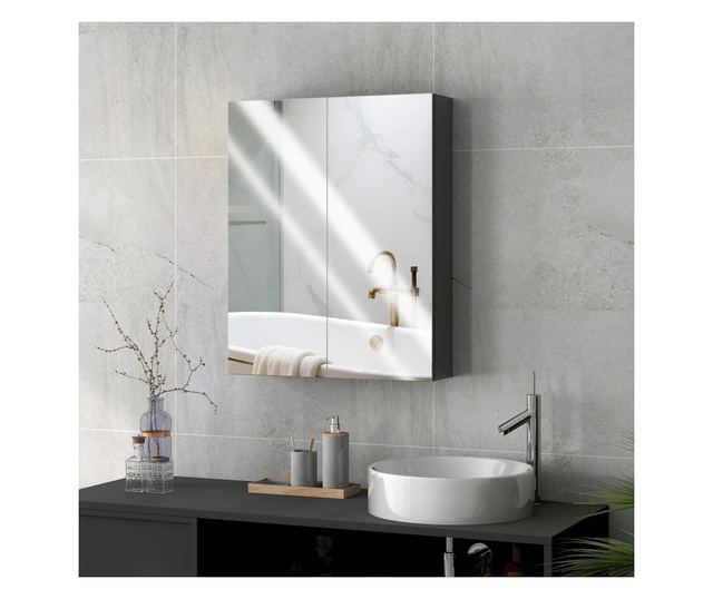 Fali fürdőszoba szekrény 2 ajtós tükörrel és 2 belső polccal 60x15x75cm, fekete