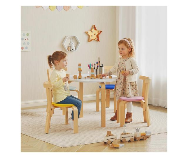 Gyerek Asztal és Szék Szett 3-8 Éveseknek, 5 Részes, Lekerekített Élekkel, Többszínű Fa