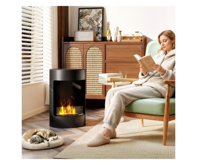 • MINDEN OLDALRÓL LÁTHATÓ ÉS FŰTŐ: Elegáns hengeres kialakításával ez a bioetanol kandalló panorámát kínál, és egyenletesen osztja el a hőt, kellemes sarkot teremtve olvasáshoz vagy nyugodt beszélgetésekhez.