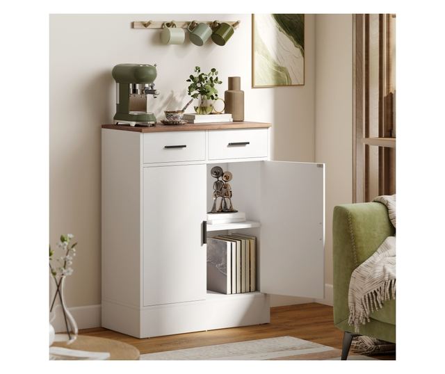 Modern tálalószekrény 2 fiókkal és 2 ajtós szekrénnyel, fehér és fa