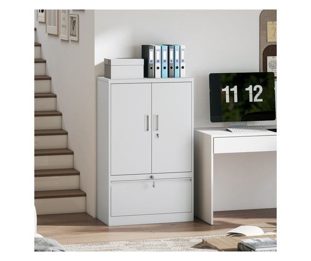 Ez a HOMCOM fém irodai szekrény egyedi megoldást kínál munkadokumentumai rendszerezésére és biztonságos tárolására. Strapabíró acélból készült, a szerkezet mind az ajtókon, mind az alsó fiókon egyedi zárakkal van ellátva, így dupla biztonságot nyújt. Tárolja munkához szükséges tárgyait a sokoldalú polcokon vagy alattuk, és állítsa vissza a rendet és a nyugalmat irodájában, dolgozószobájában vagy garázsában.