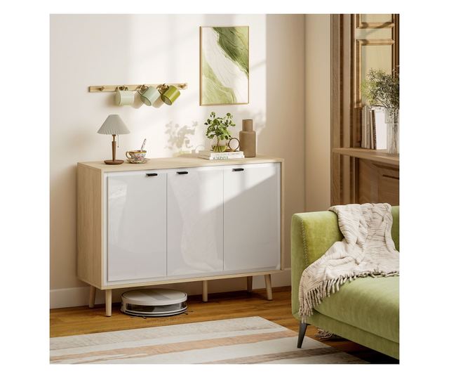 • MODERN STÍLUS: Ez a komód lenyűgöz a fényes fehér ajtókkal és a tölgyfa megjelenésű kerettel, vékony fekete fogantyúkkal és fehér betéttel, azonnal friss és modern hangulatot kölcsönözve nappalijának.