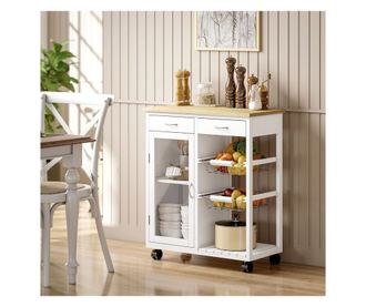 Bambusz konyhai kocsi 2 fiókkal, szekrénnyel, polccal és 2 acélkosárral, 67x35x80 cm, fehér