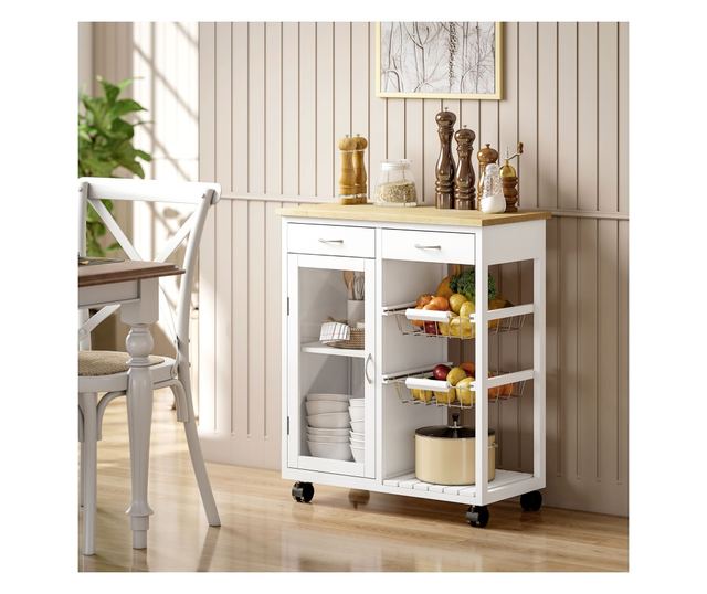 • SOKOLDALÚ KONYHAI HASZNÁLATRA: Két fiókkal az edényekhez, kivehető rozsdamentes acél kosarakkal, rácsos polccal az edényekhez és üvegajtós, állítható polccal ellátott szekrénnyel ez a kocsi segít mindent rendben tartani.