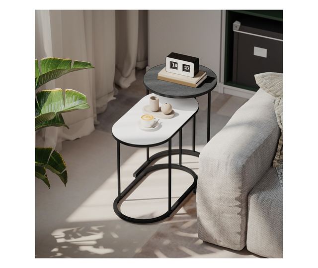 2 db egymásra rakható dohányzóasztal szett fém vázzal nappaliba és irodába, szürke és fehér