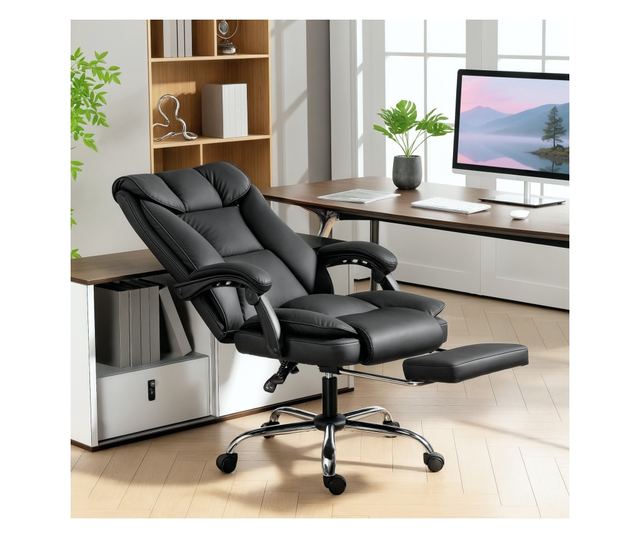 Dönthető irodai szék lábtartóval, dupla párnázással és műbőr kárpitozással, fekete