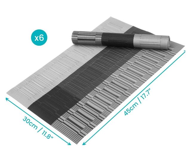6 db Alátét Szett, Belle Vous, PVC, Téglalap alakú, Hőálló, Csúszásmentes és Mosható, 30 x 44,5 cm, Szürke/Fekete