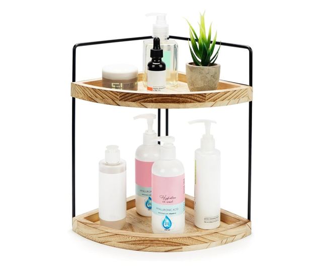 2 SZINTES TÁROLÓ POLCOK: Ez a 2 szintes sarokpolc ideális otthona rendben tartásához; Az egység mérete 28,5 cm sz x 33 cm m, és két fa polcot tartalmaz fém kerettel.