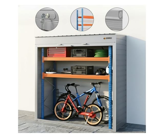A fém szerkezet és a ferdetető ideálissá teszi kültéri használatra, bőséges tárolókapacitást kínálva anélkül, hogy vizuálisan elborítaná a teret.