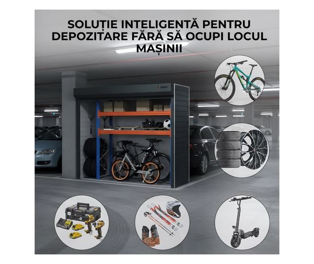 A PARKINGBOX® GRANDE egy fém tárolószekrény redőnyajtóval, amelyet a gyakran kihasználatlan terek maximális kihasználására terveztek: