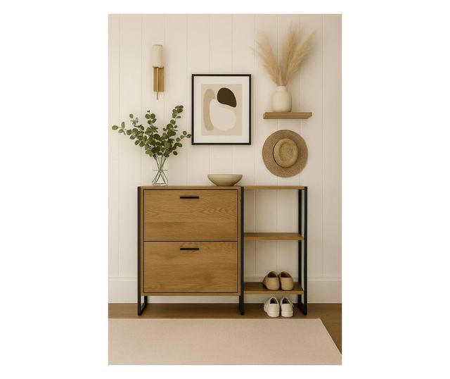 A 85x24xH95 cm-es teljes méreteivel ez a cipőtartó két zárt rekeszt kínál a cipők számára, valamint két nyitott polcot. Sokoldalú, kompakt kialakítása bármilyen térbe alkalmassá teszi anélkül, hogy kompromisszumot kötne a tárolókapacitással, kortárs és praktikus megjelenést kölcsönözve. A rekeszek MDF-ből készültek, tölgyfa felülettel, ami természetes és kifinomult megjelenést kölcsönöz, tökéletesen kiegészítve a fémvázat.