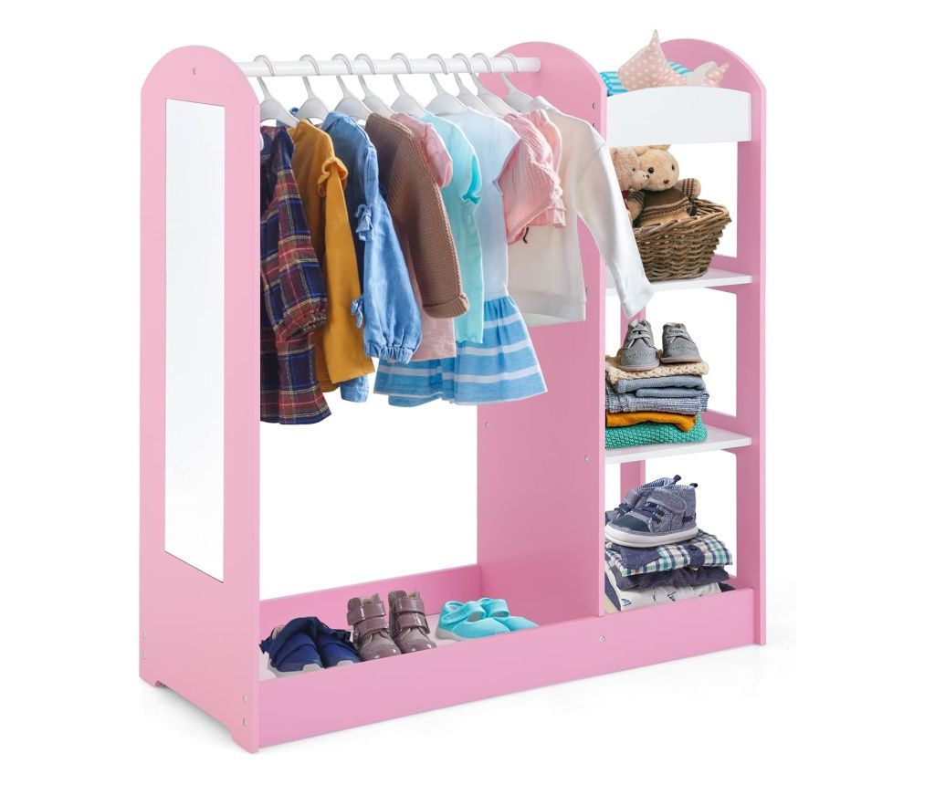 GINGER HOME Gyerek Ruhatároló Tükörrel - Nyitott Gyerek Szekrény Polcokkal és Akasztókkal, Rózsaszín, 94x38x100 cm
