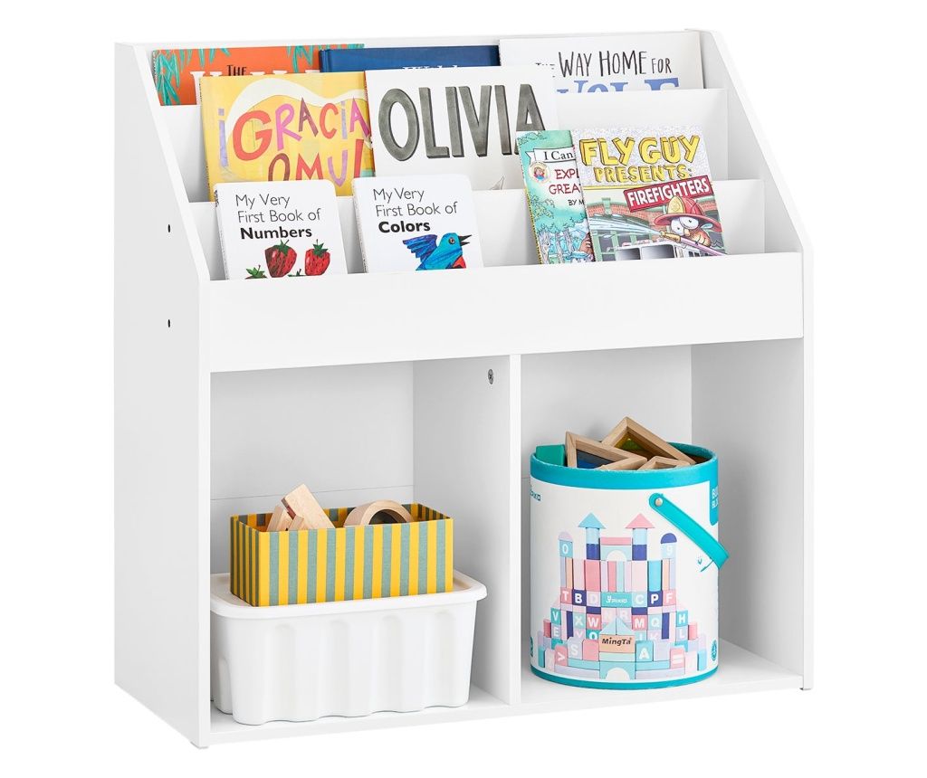 SoBuy gyermek könyvespolc játékpolc 3 polccal és 2 tárolószekrénnyel fehér fából